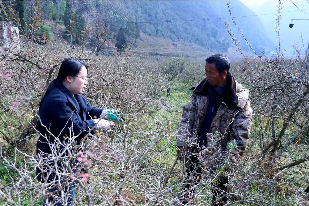 六盘水市农科院专家王梦柳在刺梨基地对野钟村村民徐田勇进行冬季管护指导