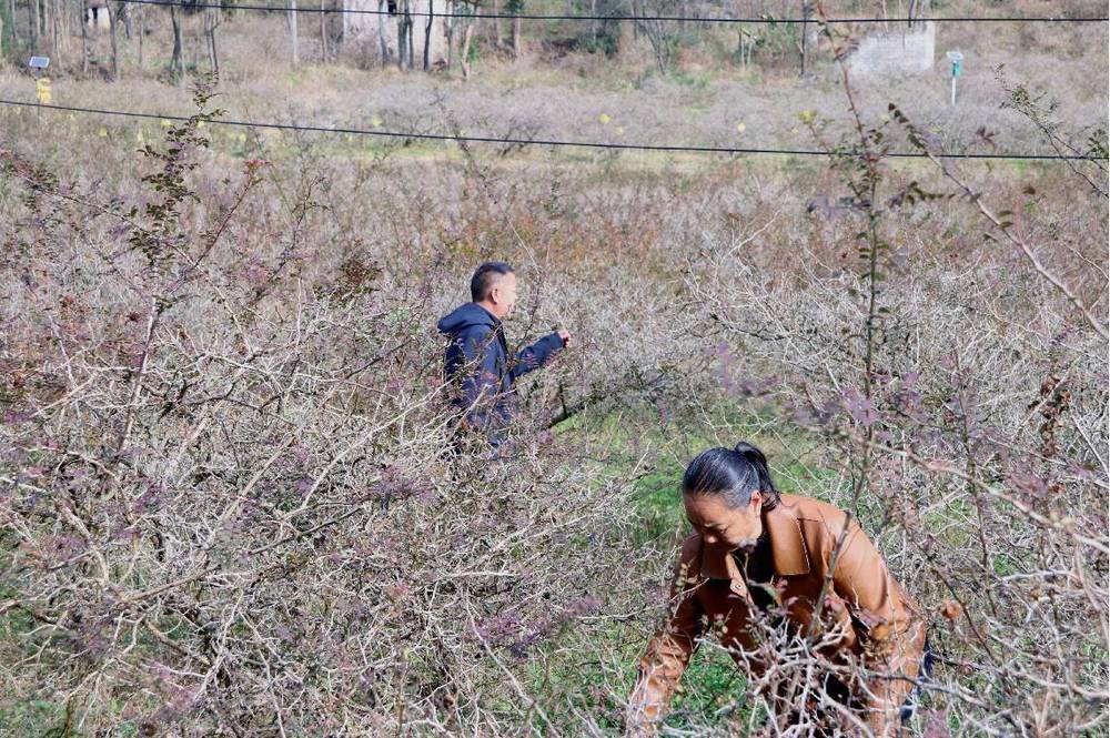 唐发开与妻子在刺梨基地进行刺梨冬季管护