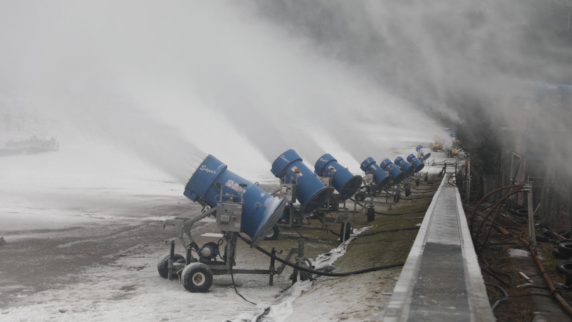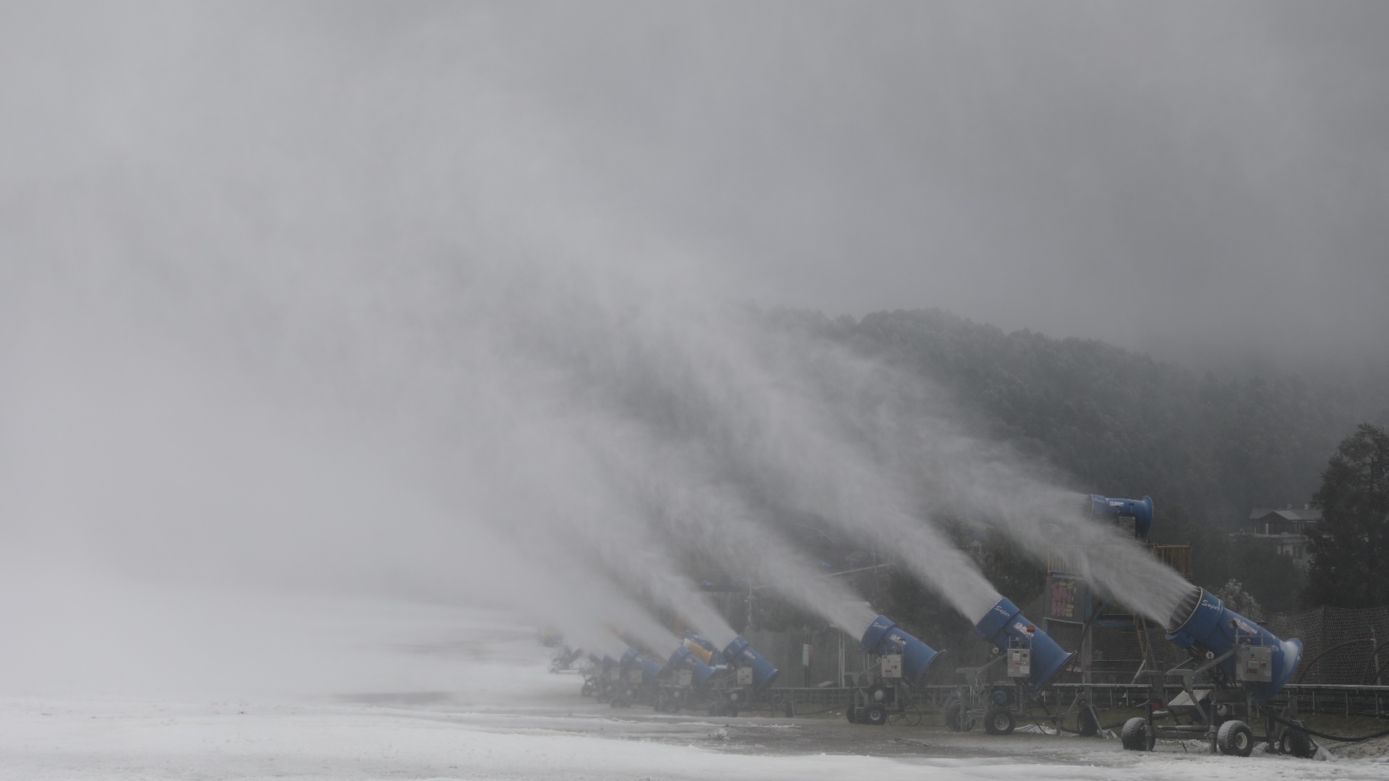 玉舍雪山滑雪场内,数台造雪机同时启动(朱芸 摄)