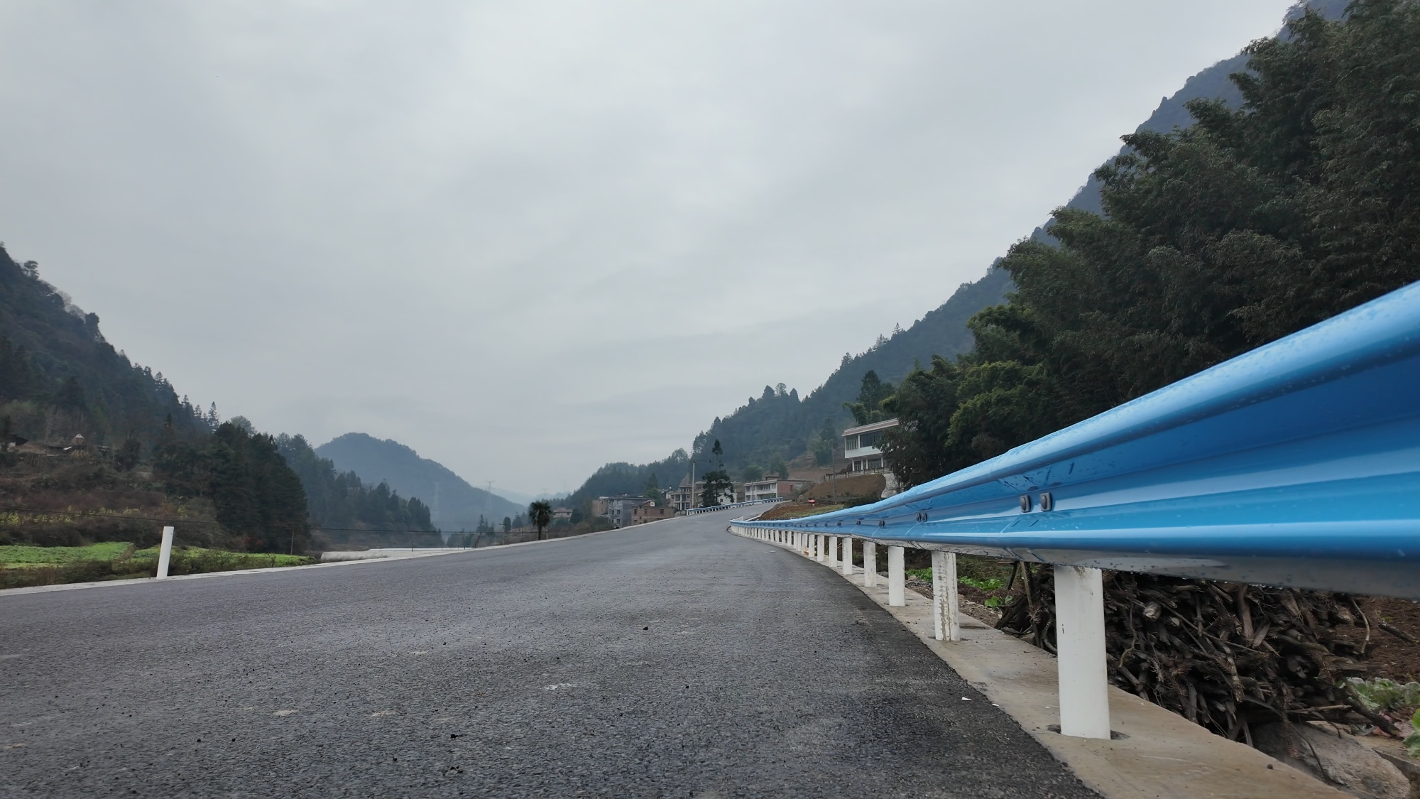 眼前,沥青路面如同一条墨色绸带,静静铺展在群山翠绿之间。一切就绪,只等车来。