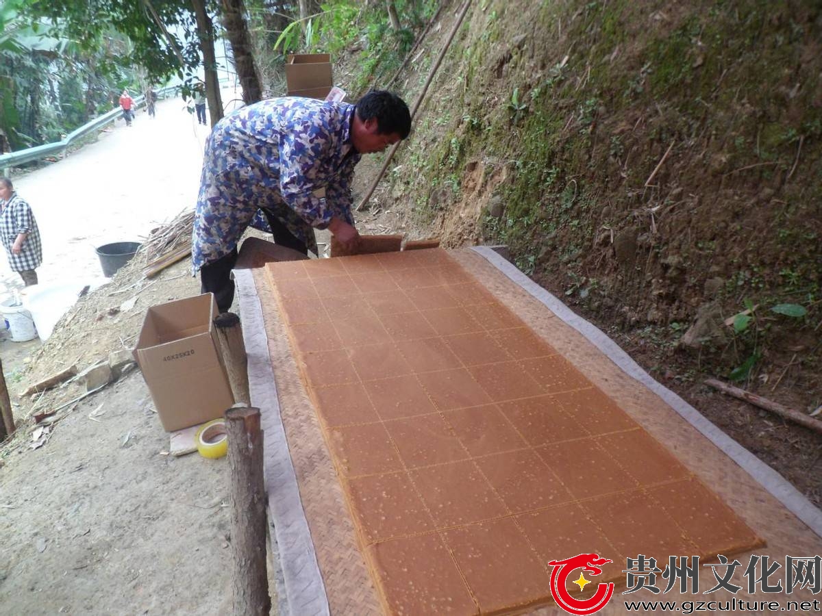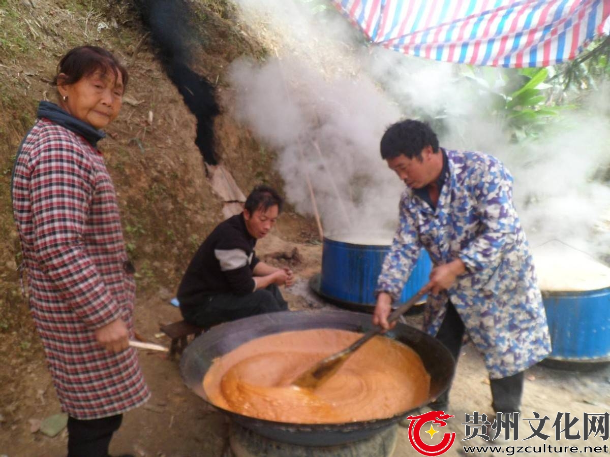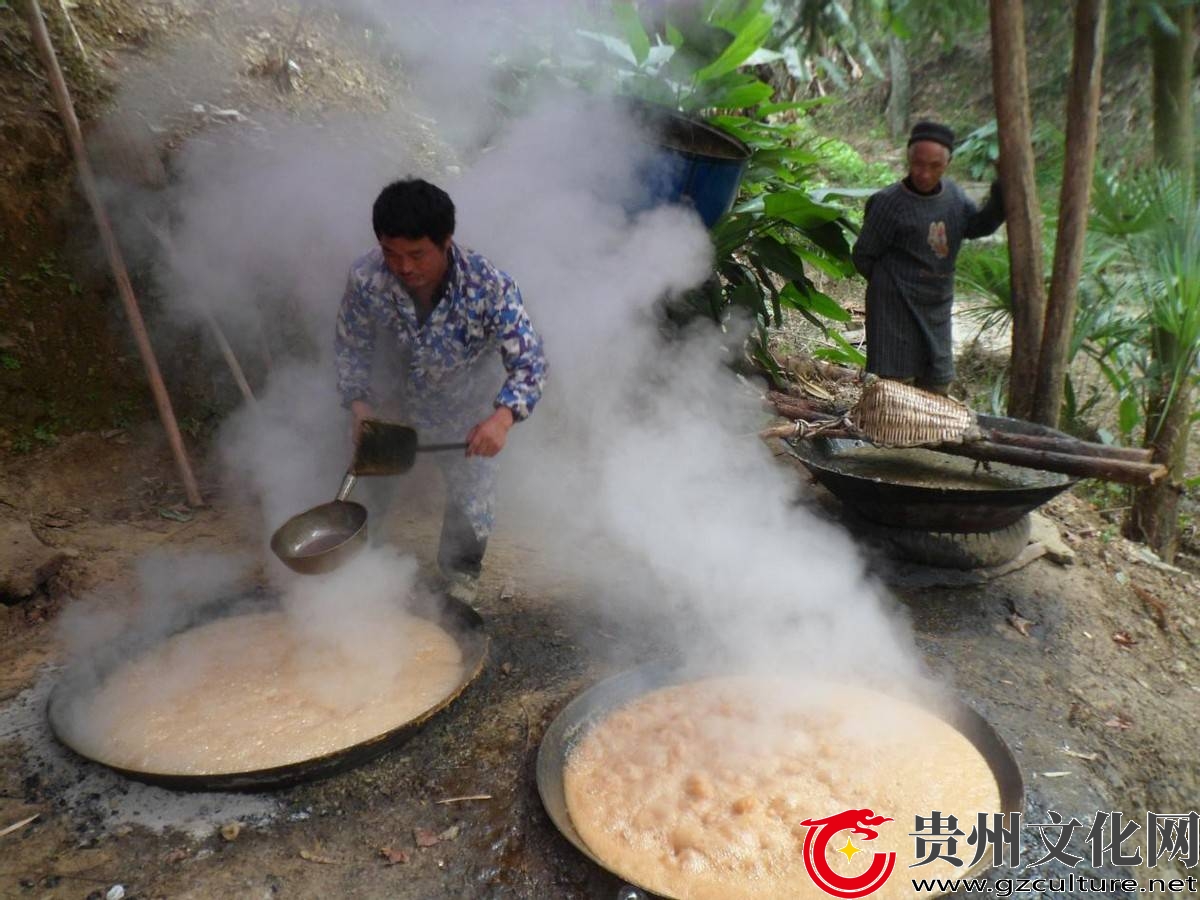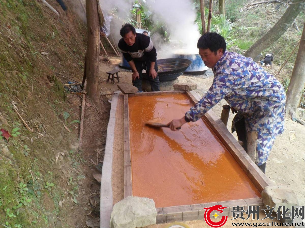 扁占村一组陈光福用木铲均匀地滚压糖浆