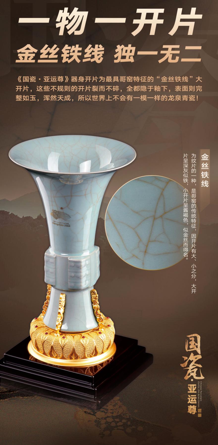 龙泉青瓷是中国瓷器的代表,是浙江最具代表的“文化符号”之一;龙泉青瓷传统烧制技艺始于三国两晋,兴于宋元,在南宋时期达到鼎盛,是联合国教科文组织《人类非物质文化遗产代表作名录》中首个入选的陶瓷类项目;花丝镶嵌是展示中华文明之美的非遗技艺,具有四千年的历史,历来只为皇家御用,被誉为“燕京八绝”之首。《国瓷·亚运尊》以中国为“尊”,将亚运精神与荣耀梦想交相辉映,以龙泉青瓷、花丝镶嵌两大非遗跨越千年的文化碰撞,向世界展现“中国新时代,杭州新亚运”的精彩纷呈。