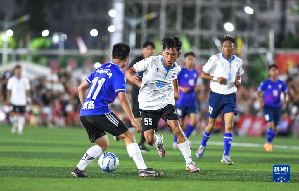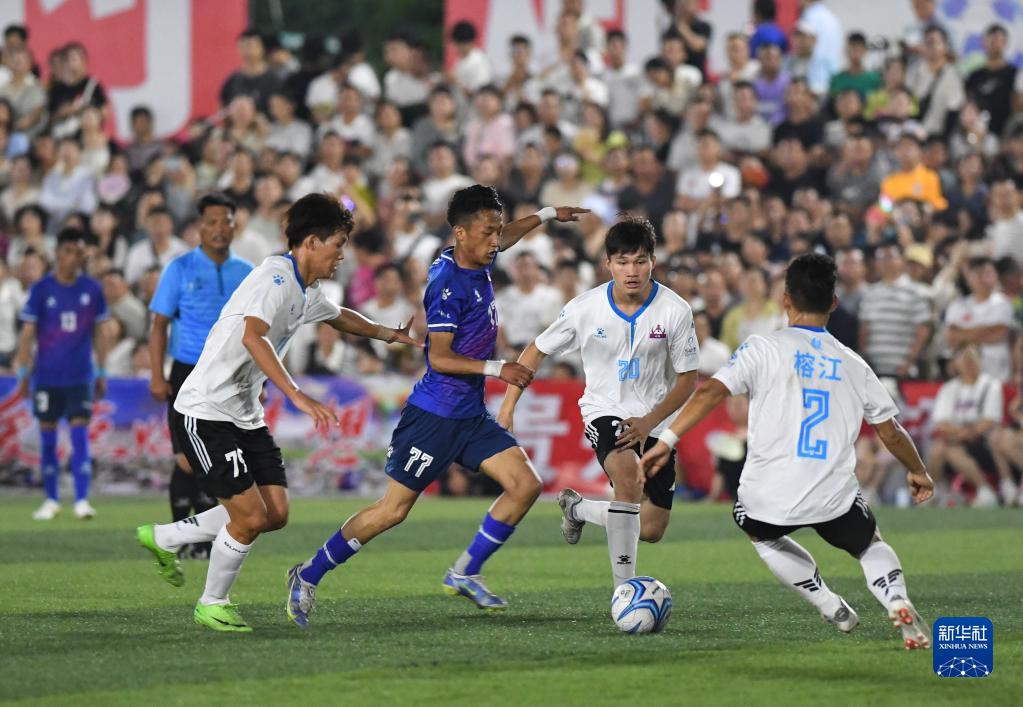 6月23日,贵州省榕江县足球队球员在与青海省果洛州格萨尔王足球队的友谊赛中拼抢。新华社记者 杨文斌 摄