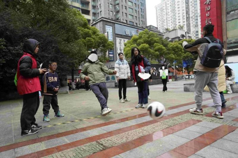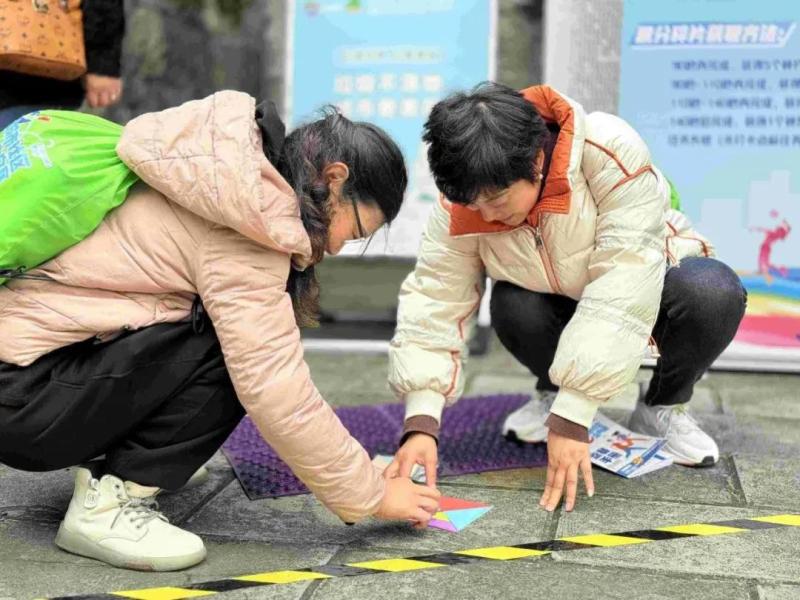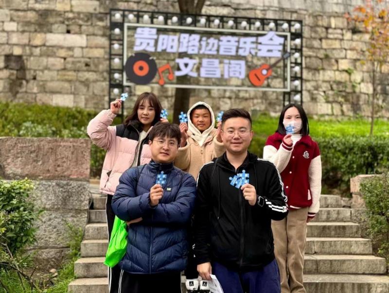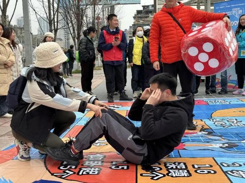 当天开赛后,参赛者们奋力地奔向各个打卡点,投入比赛当中。“左边,左边,往右,往右……”在赛事起点红星美凯龙多功能运动场就有任务真人“大富翁”挑战,在富水中路、南明区甲秀广场等活动点标,有迷你拔河、七巧板接力赛、蒙脸踢球等游戏,也让参赛者连呼过瘾;在曹状元街,参赛者通过和身着古装、现代装的NPC进行互动、合影,玩得不亦乐乎,感受到了一趟穿越古今的定向打卡之旅,甚至还在文昌阁前参与互动游戏“唱响贵阳”,一展歌喉。