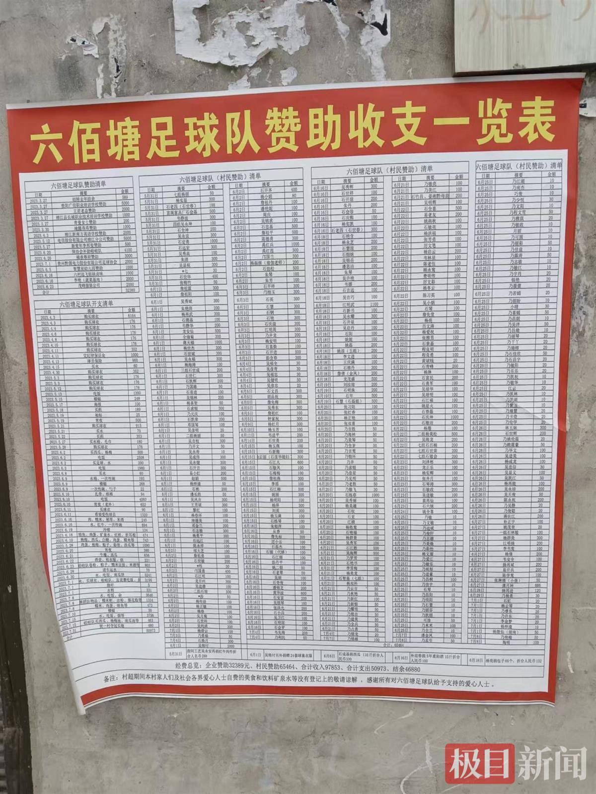 六佰塘村在墙上张贴了村足球队今年的详细收支,收入来自几十家企业和几百名村民的赞助,村民最少的10元,最多的1100元。此外,还有村民捐赠西瓜、酒、包子等实物。球队的开支,主要是用于买球衣、买水、赛后聚餐等。表格显示,今年六佰塘队收到企业赞助32389元、村民赞助65464元,支出50973元,结余46880元。