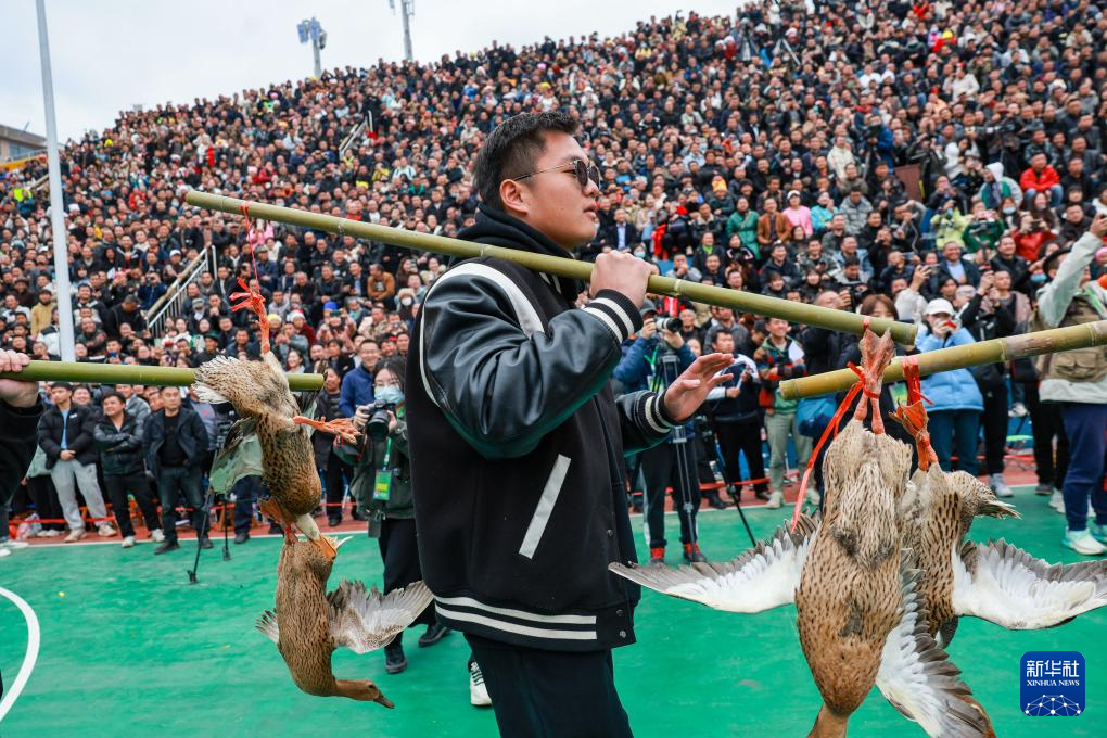 2023年3月27日,村民挑着当地农特产品“三穗麻鸭”进入赛场。这是季军铜仁市代表队的奖品。