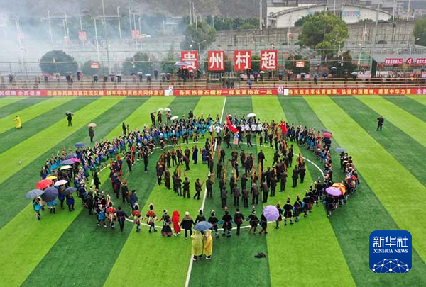 1月6日,人们在2024年贵州“村超”预选赛开幕式上表演民族节目(无人机照片)。新华社发(杨文舒 摄)