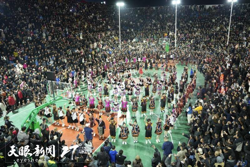民族文化节目蹦苗迪在“村BA”球场上演。龙军 摄