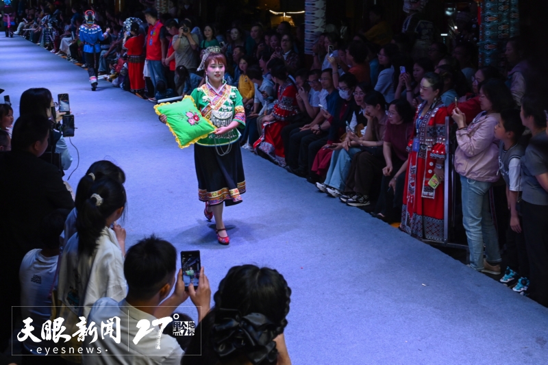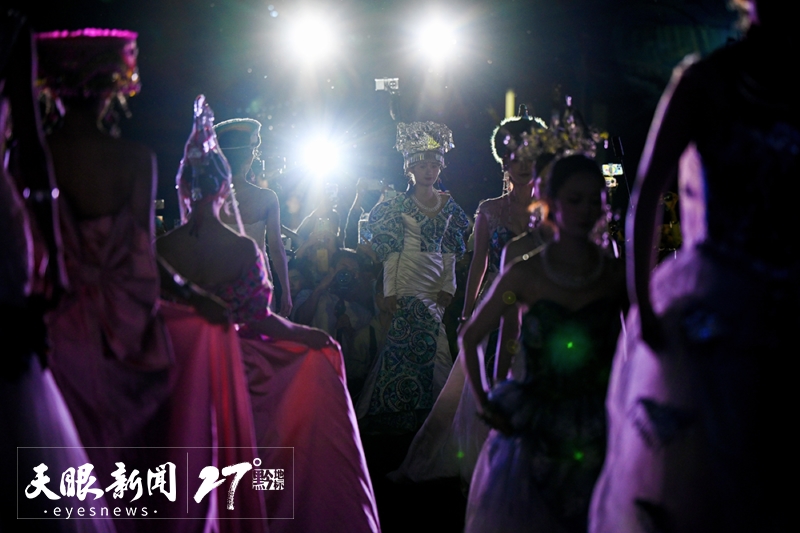 去年7月,杨春林和母亲回到凯里。在黔东南州建州68周年的当天,他邀请父老乡亲以农具为道具、以传统服饰为媒介,集体演绎一场非遗时装大秀为故乡“庆生”,成为了如今贵州“村T”的初舞台。