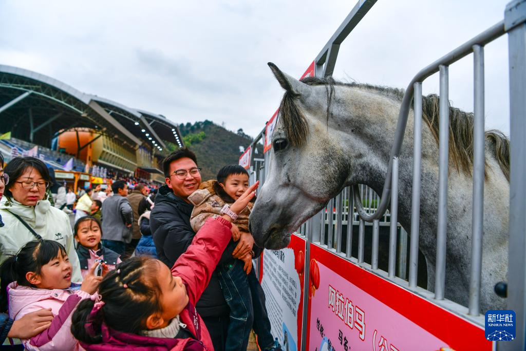 1月1日,孩子们在贵州省三都水族自治县“村马”比赛现场与马匹互动。新华社记者 杨文斌 摄