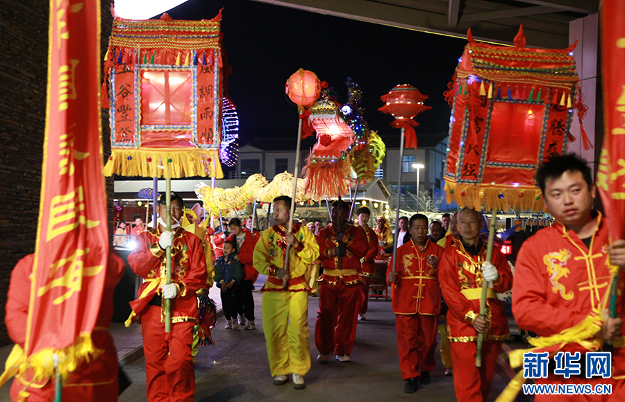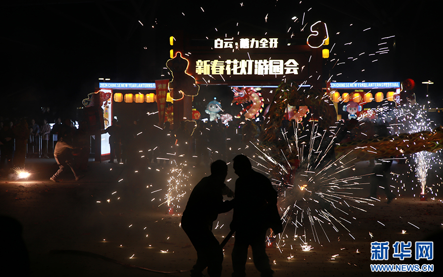 2月19日,在2024贵阳·白云蓬莱仙界“蘑力全开”新春花灯游园会上举行舞龙嘘花民俗活动。新华网 刘昌馀 摄