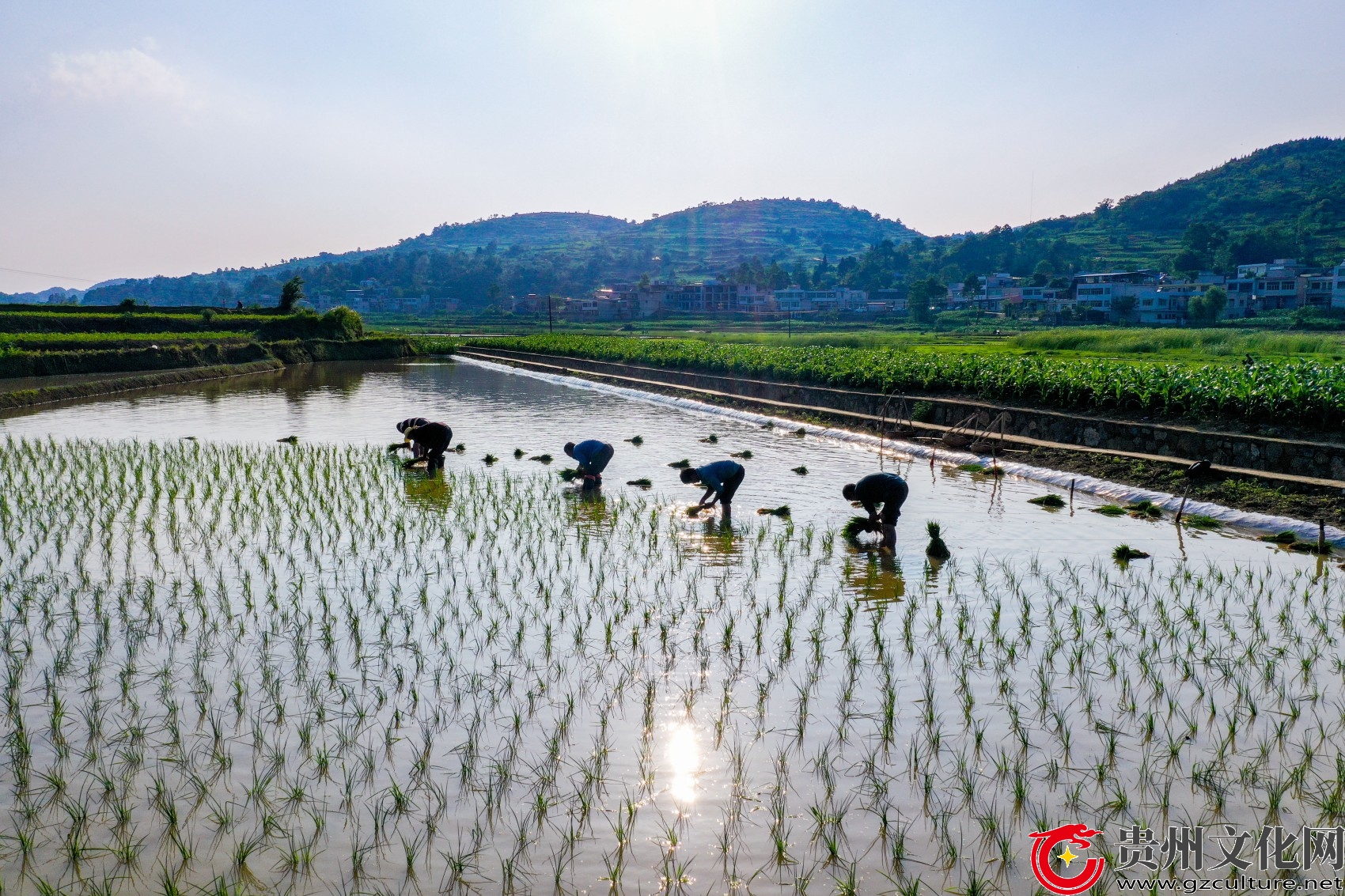 2025年6月5日,农民在贵州省黔西市锦星镇文阁村内庄田坝插秧。当日是“芒种”节气,在贵州省黔西市锦星镇内庄田坝,当地村民抢抓农时开展水稻插秧,田间地头呈现一派忙碌景象。贵州文化网发(胡毅 摄)