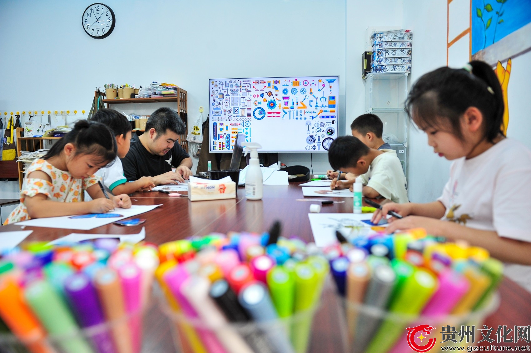 2025年7月12日,学生在贵州省黔东南苗族侗族自治州从江县一家艺术中心学习手工。