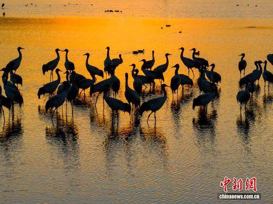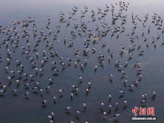 12月10日,贵州省毕节市威宁彝族回族苗族自治县草海国家级自然保护区,成群结队的黑颈鹤悠闲觅食,栖身保护区,尽显生态之美。管庆巍 摄